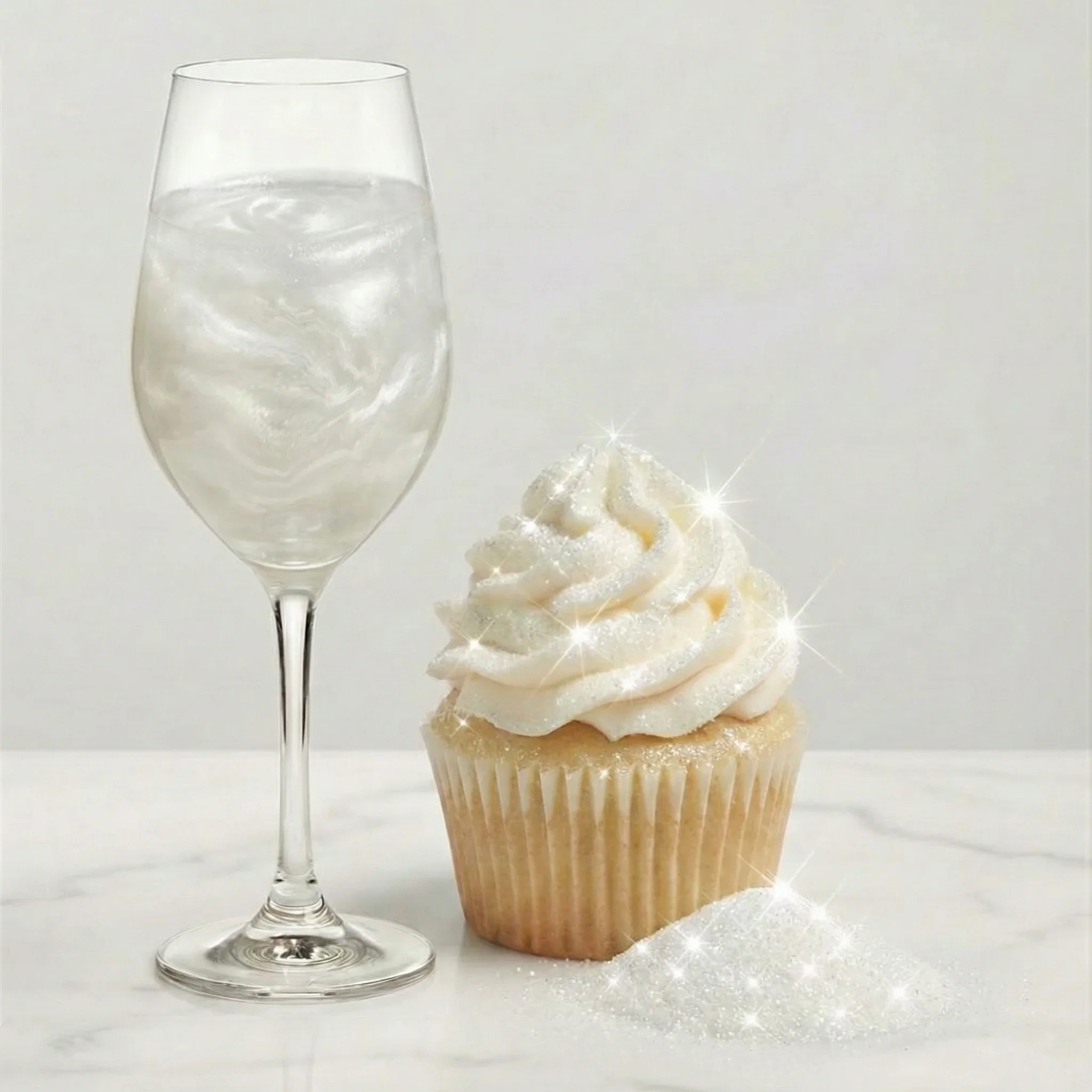 Premium German-imported mica-based pearlescent pigments. 100% FDA compliant. Completely tasteless and odorless — your flavors stay exactly as you intended. Edible white glitter for drinks and baked goods alike. Vegan, gluten-free, dairy-free, nut-free, and non-GMO. Available in 10g, 50g, 1lb, and 1kg sizes — in both jar and pump spray formats.